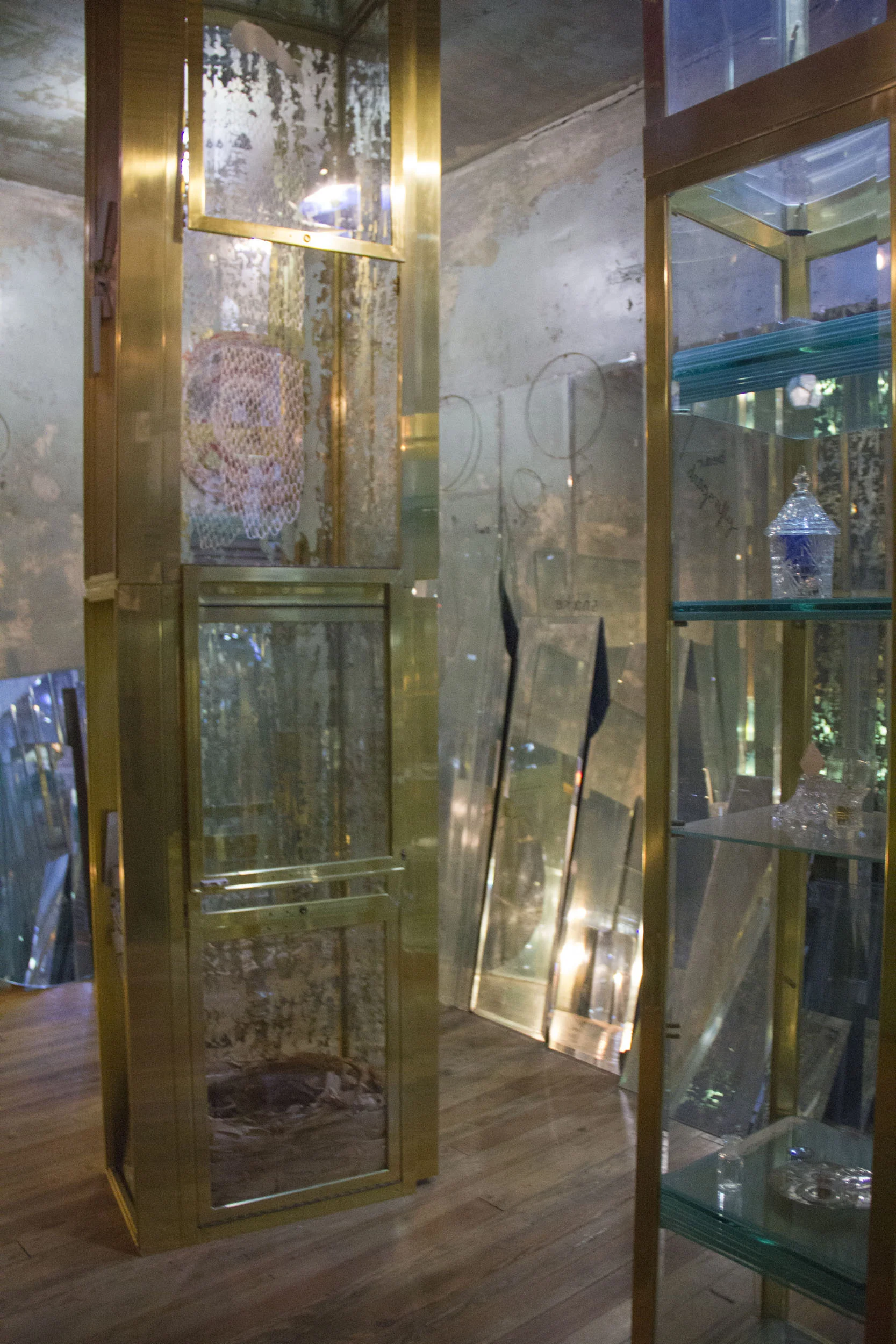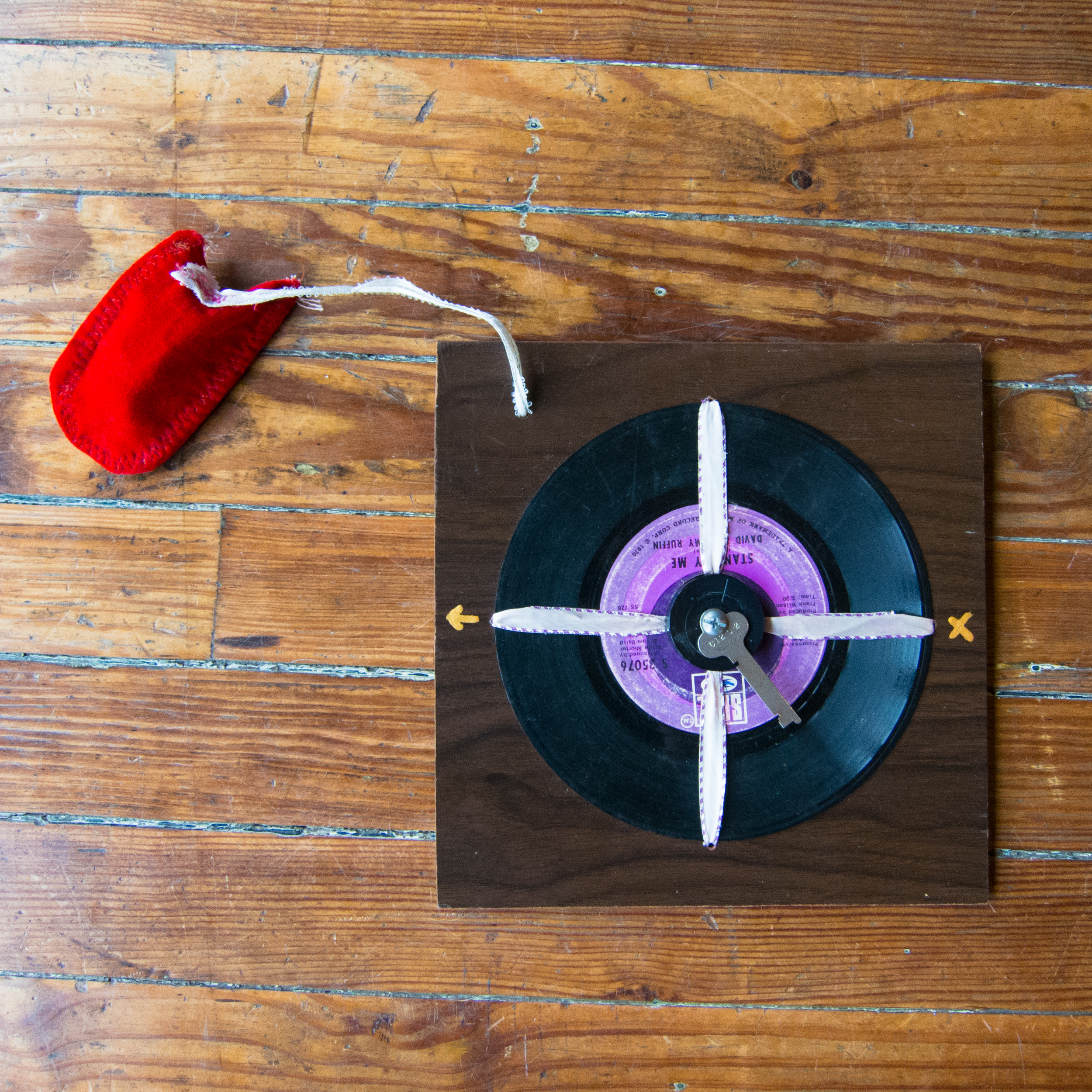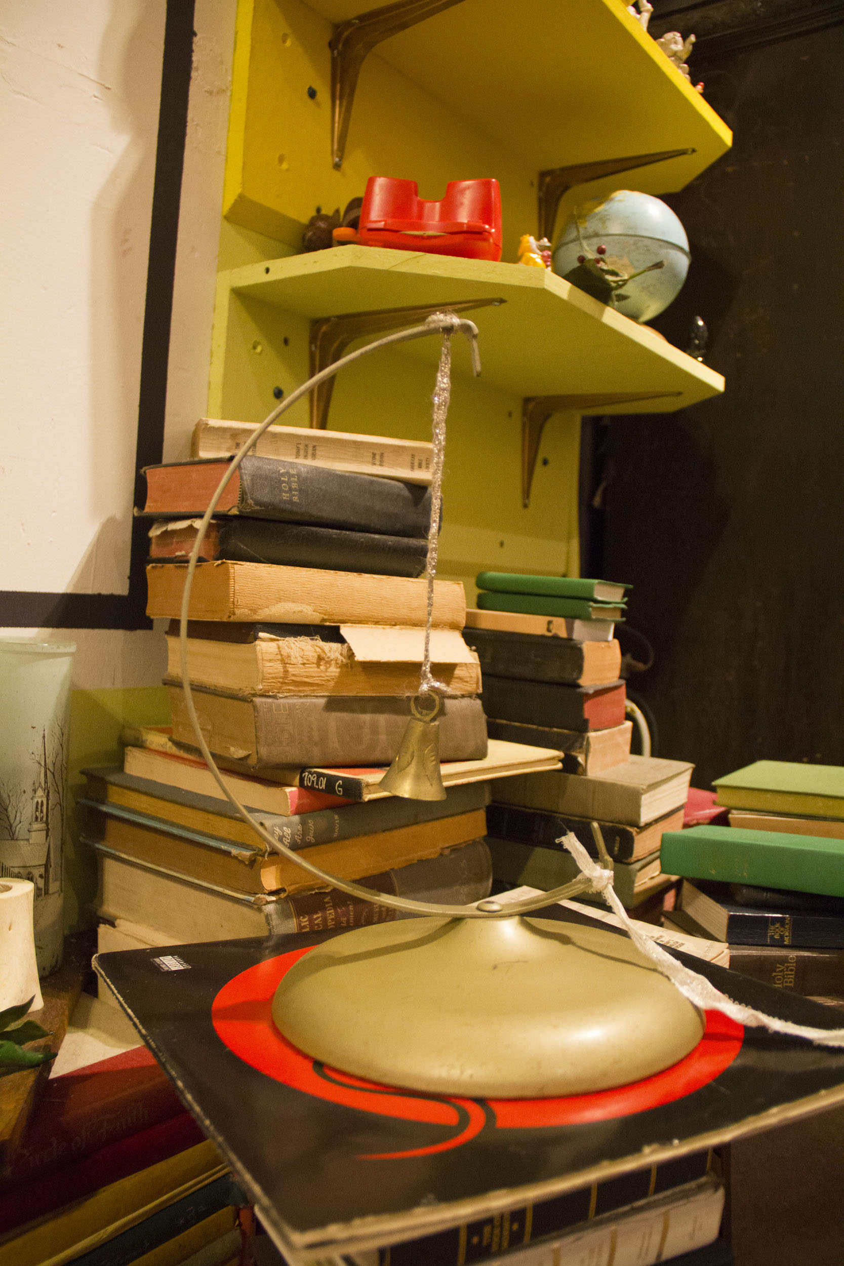 Materials: fabric, key, record, dice, a glass, a book, a bell, a mirror, a plate, found objects at Elsewhere