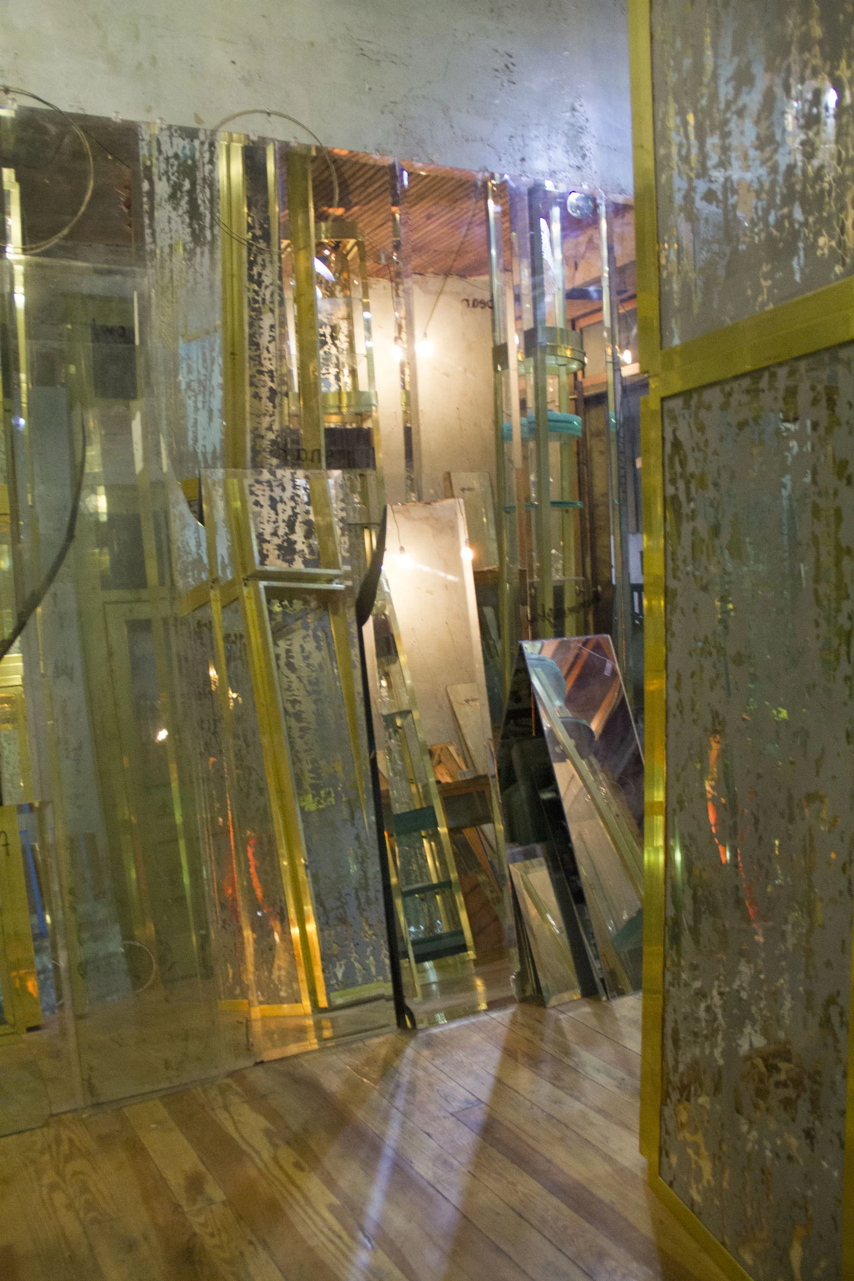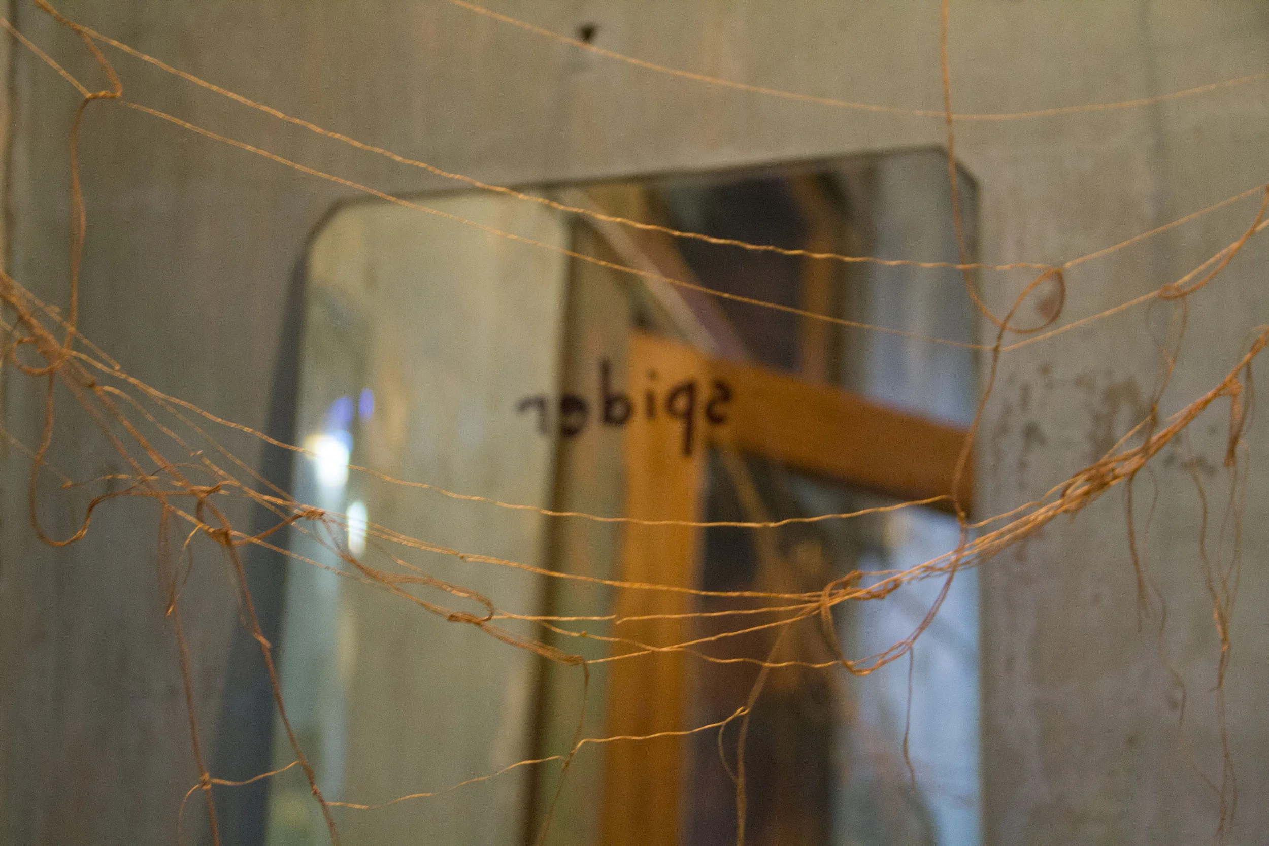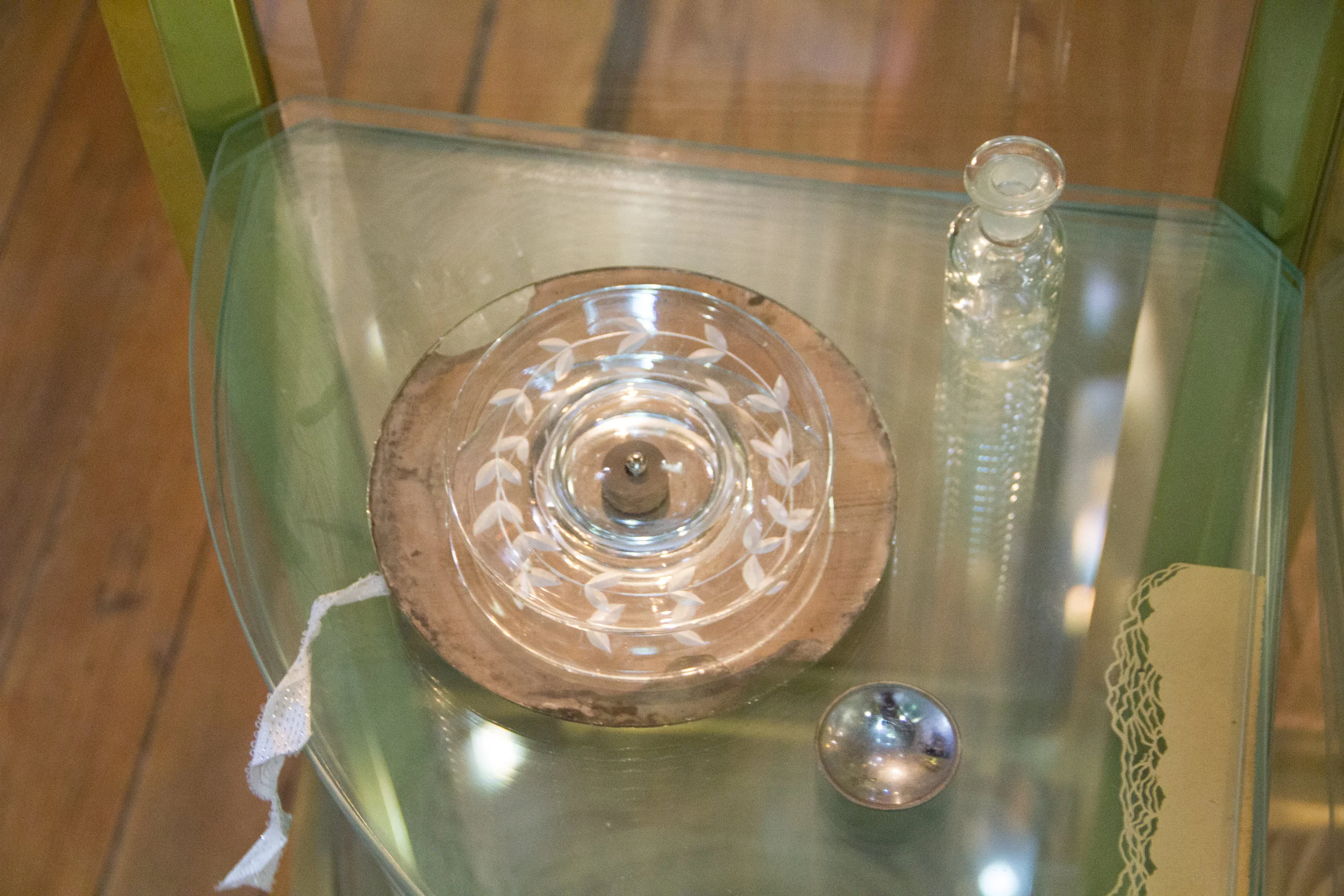 Materials: fabric, key, record, dice, a glass, a book, a bell, a mirror, a plate, found objects at Elsewhere