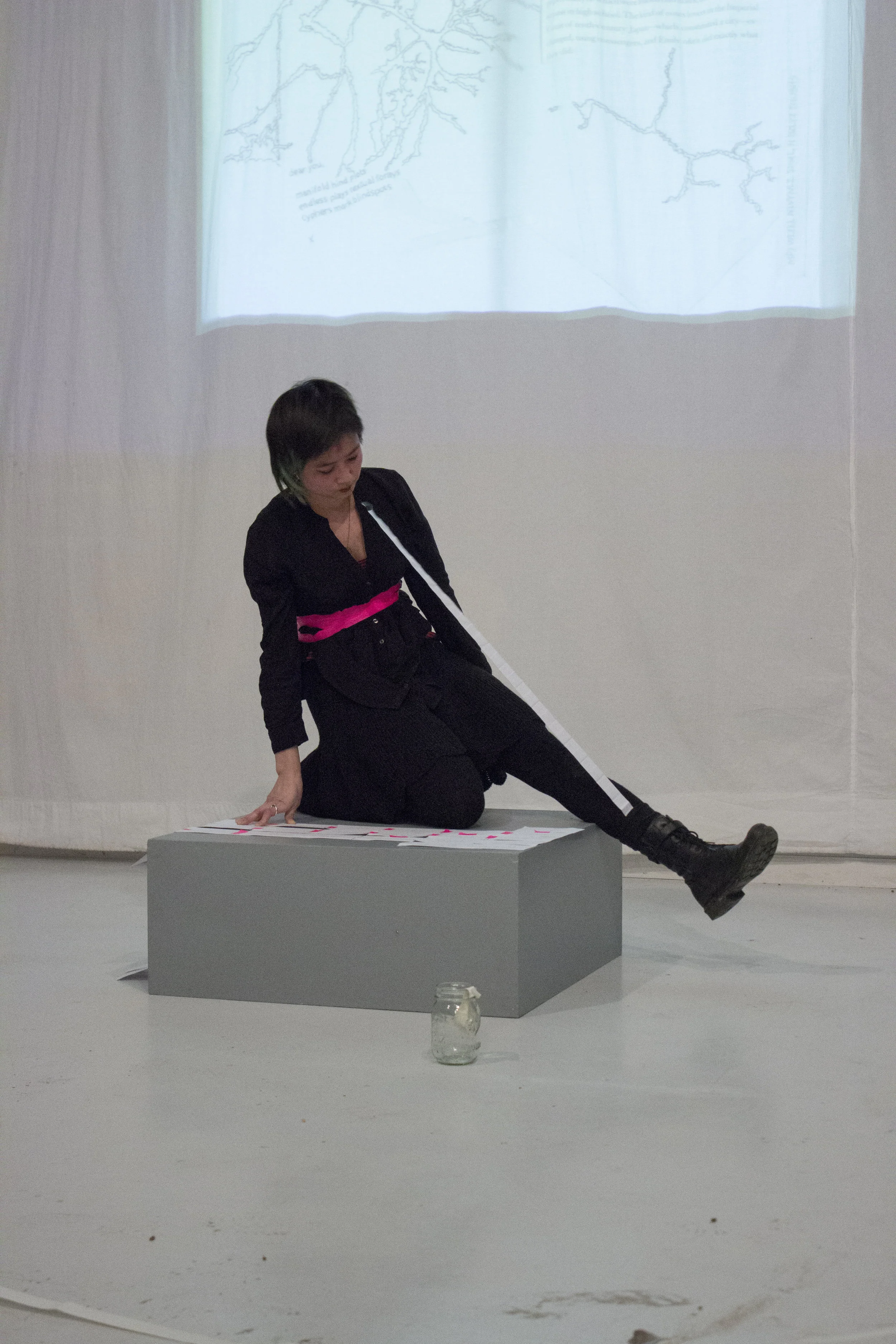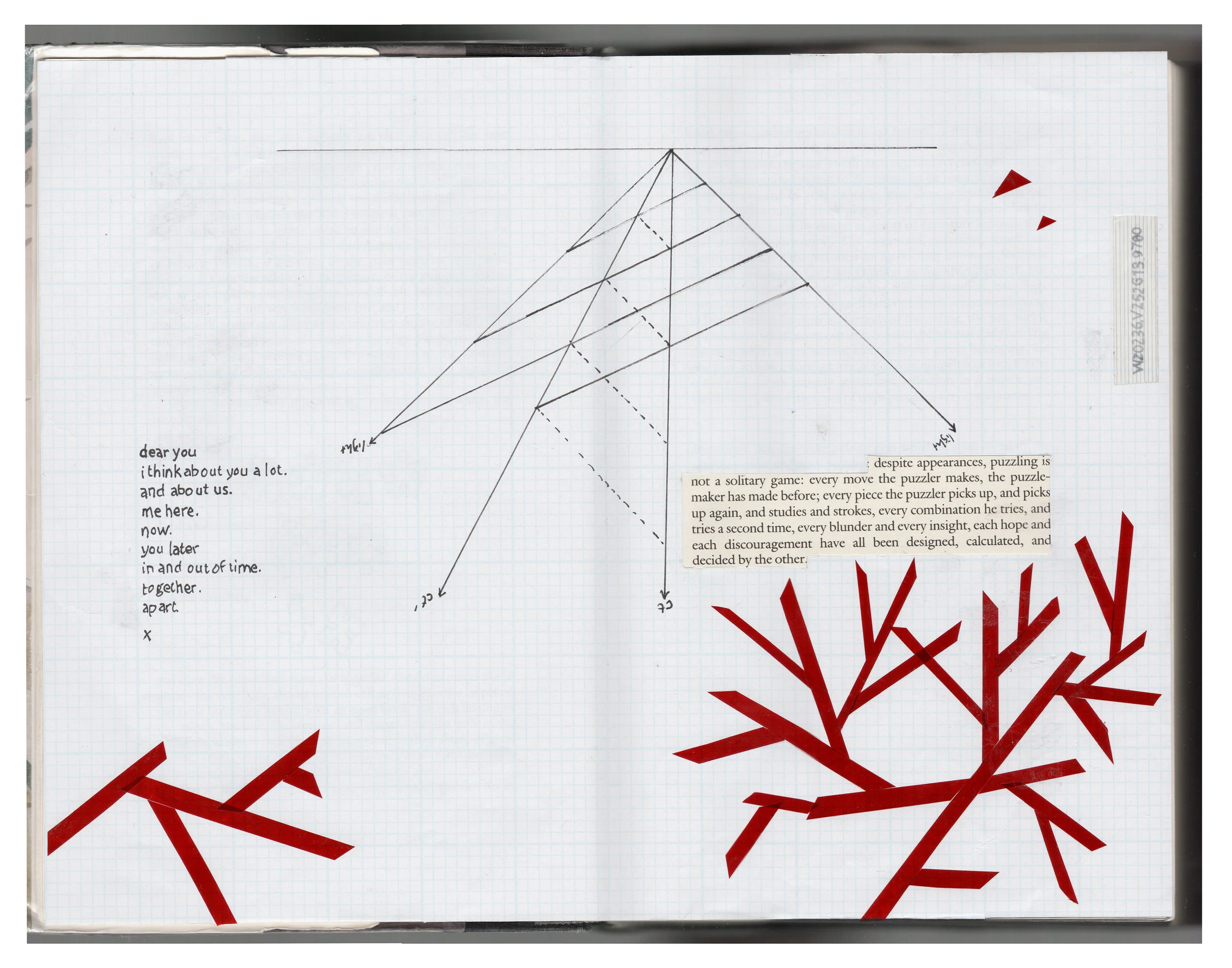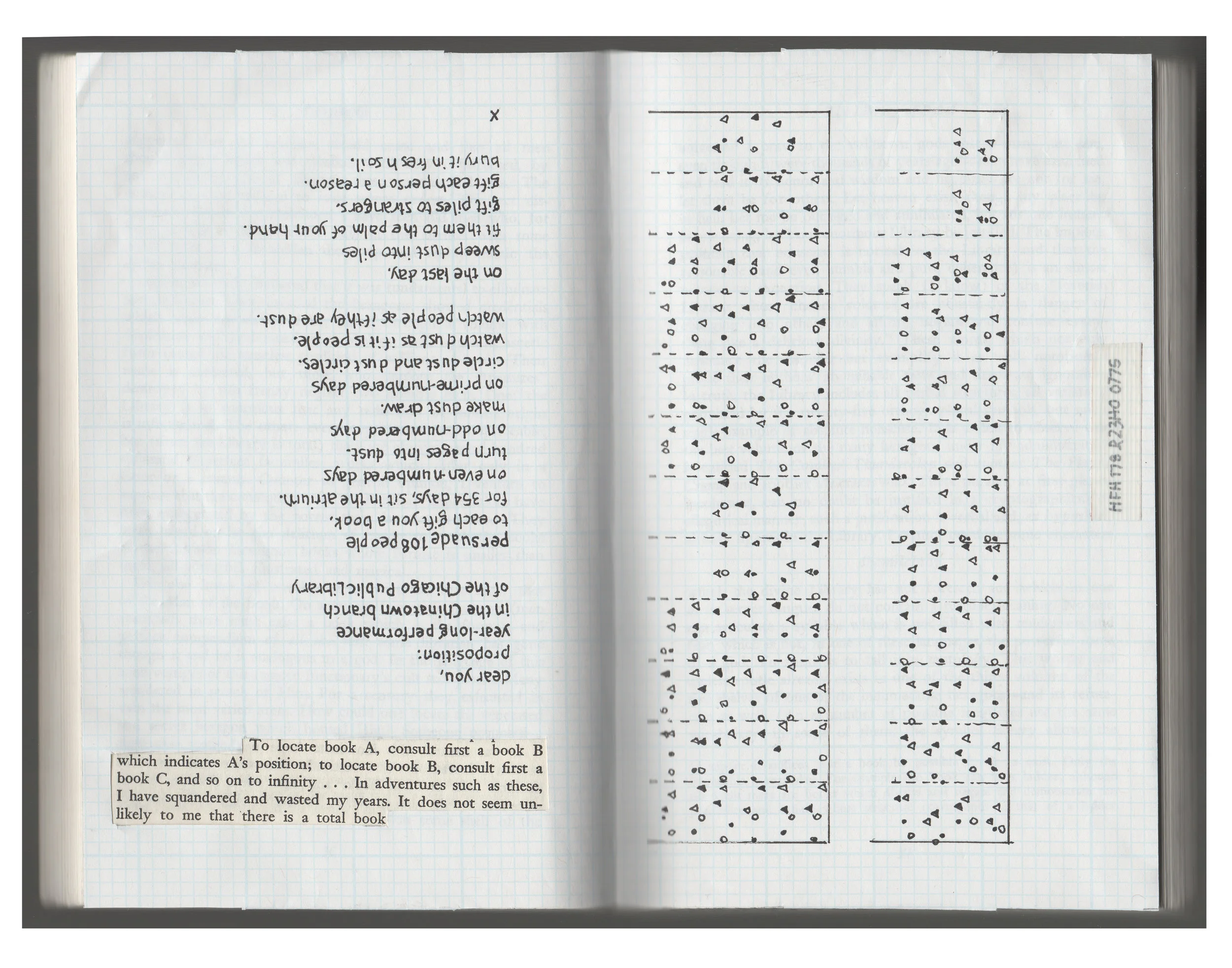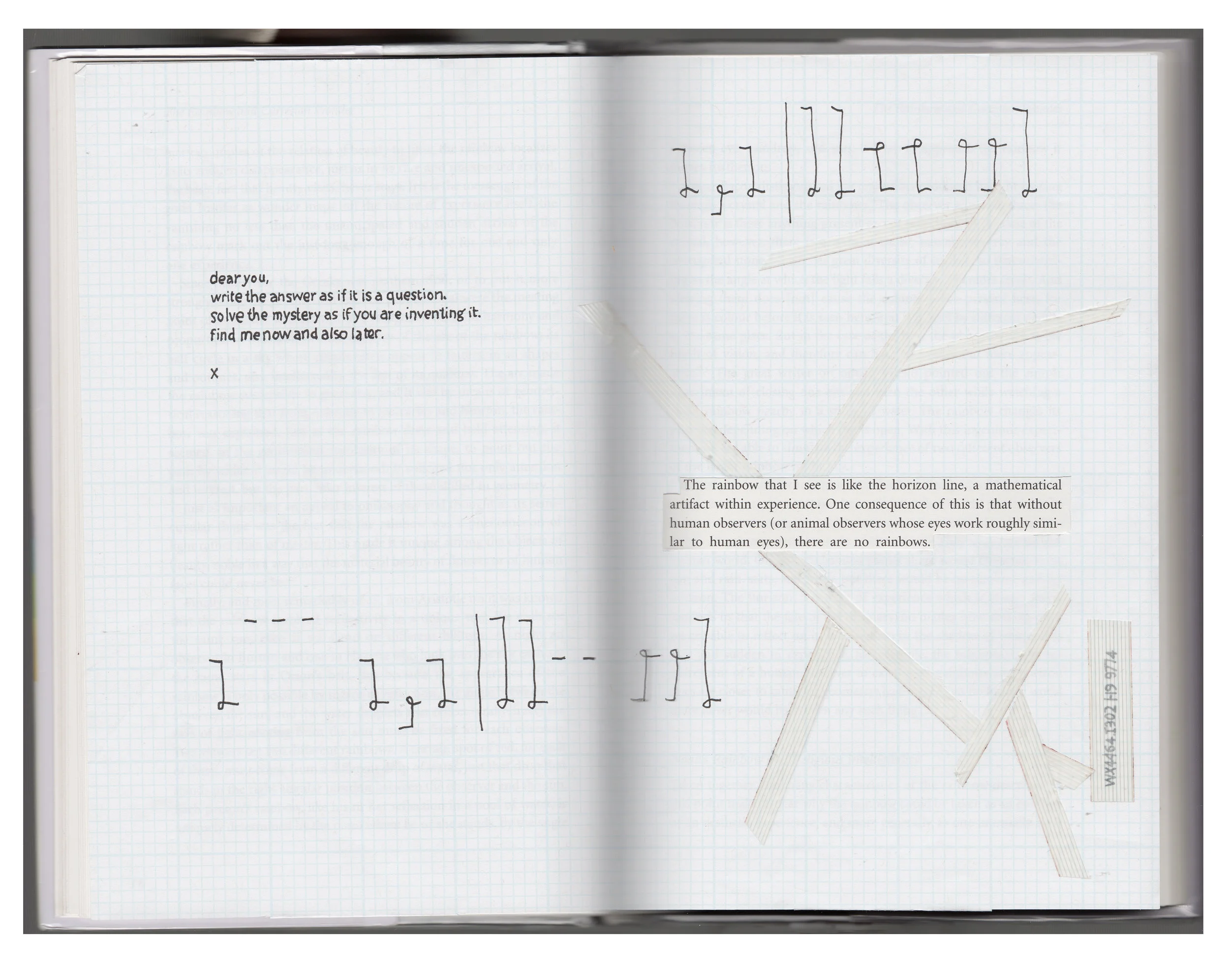 A performative lecture conflates secondary and primary audiences in speculating on and archiving a public art project that constructs a puzzle connecting several books through encryption in the Chicago Public Library system. Letters with cryptic messages found in books from the Chicago Public Library become a score. The visual language of bird vocalization, space time diagrams, circuit diagrams, and animal movement invoke gestures of coding and decoding that “reveal” text, in parallel to a system of encryption.