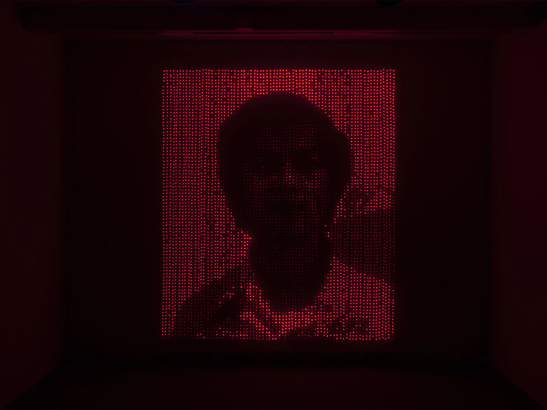 A black and white photograph of the artist’s father taken at a refugee camp in Korea. In the light, you can barely make out his features. A three digit number, hand-lettered, is pinned to his shirt lapel. My mother sits hunched over, one leg up. Her eyes are closed. Her forehead rests on her knee. I often sit like this on a chair. At five second intervals, light turns to dark turns to light. The gong of a Buddhist prayer bowl strikes every ten seconds. At the same time, the lights go out.