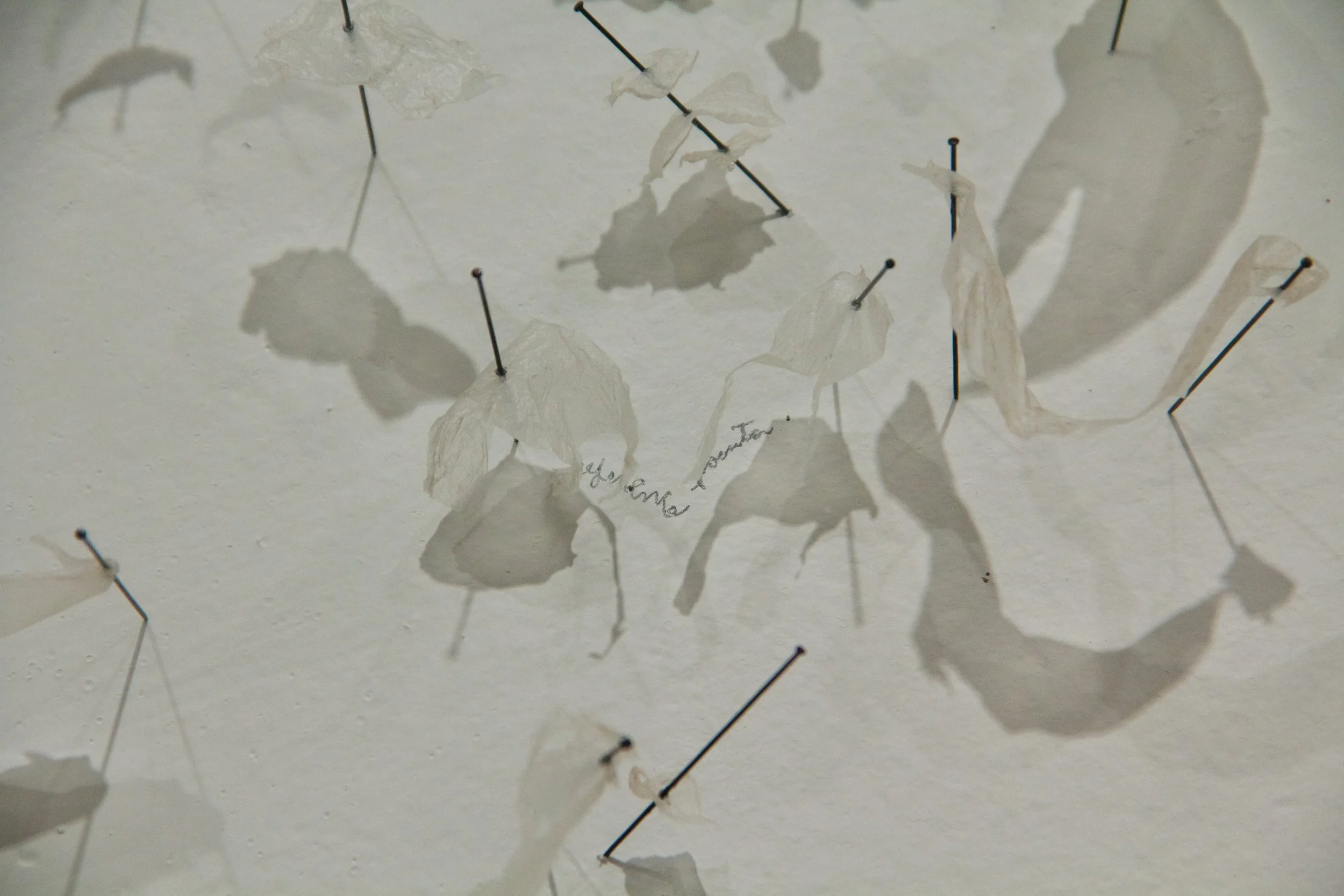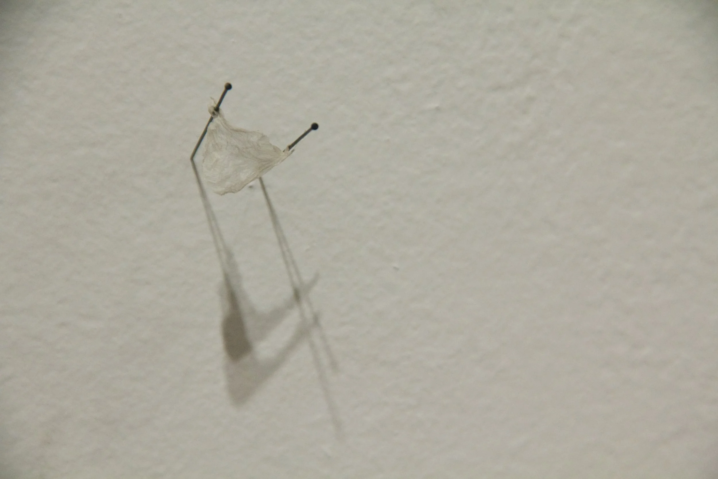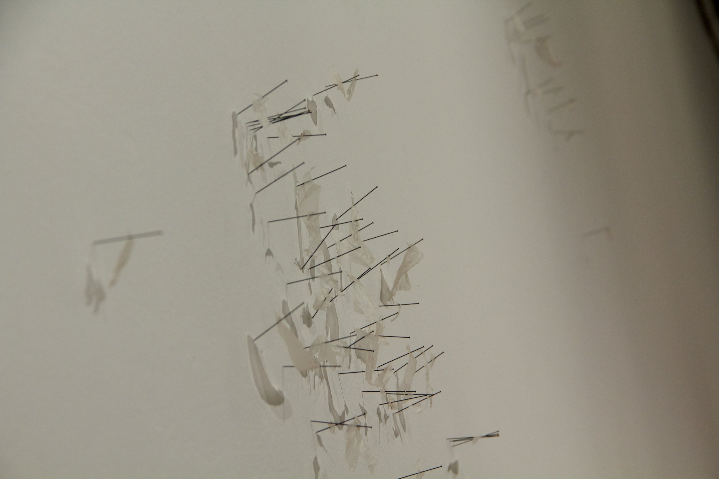 Cells burn. I peel and map the paper thin geography of 2,169 days on a wall. Shadows flap in the wake of passing bodies. Binoculars hang on an opposite wall. Skin fragmented and separated from body becomes its own body.