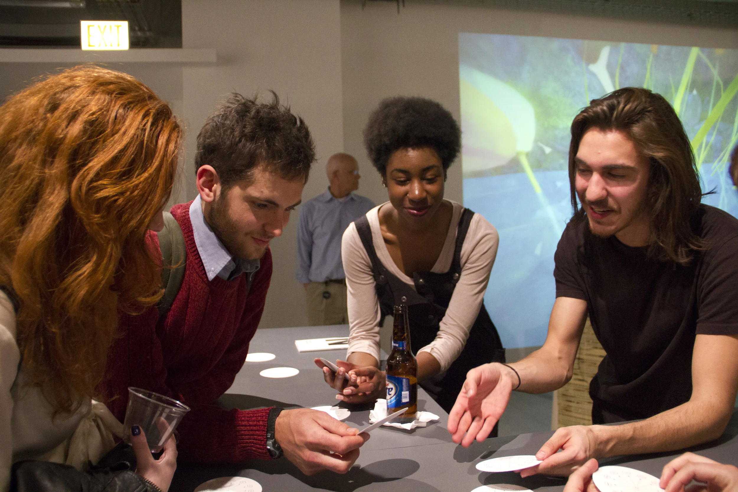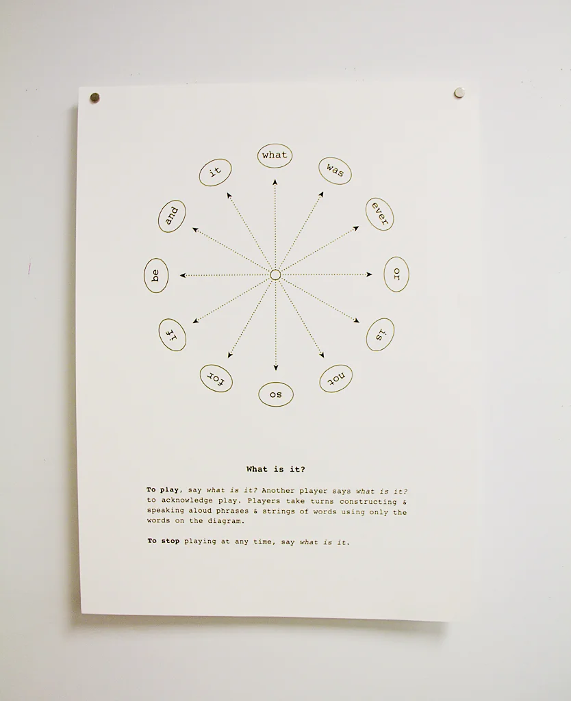 Words into lines into thought into sound into space. An existential word game printed on coasters left at bars and parties. Play connects players through improvisation and the material of language, limited to 12 words on a diagram. Gertrude Stein, John Cage and Chuang-Tzu walk into a bar.